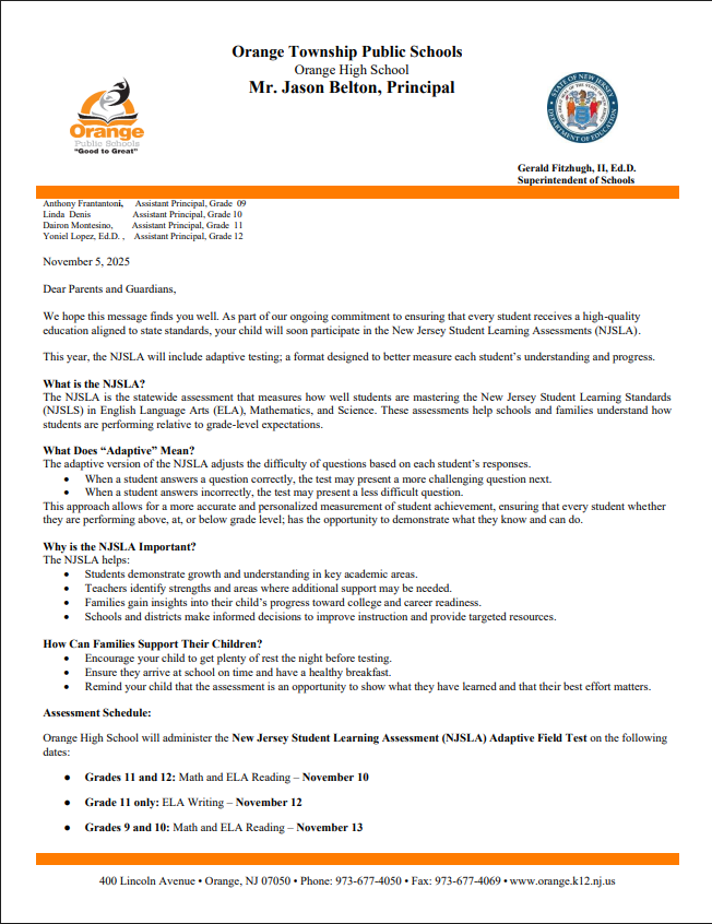 Orange High School is a vibrant and diverse learning community committed to academic excellence, personal growth, and community involvement. Located in the heart of Orange, NJ the school offers a wide range of programs, including advanced academics, arts, athletics, and career pathways. With dedicated staff and a supportive environment, Orange High prepares students for success in college, careers, and life beyond the classroom.